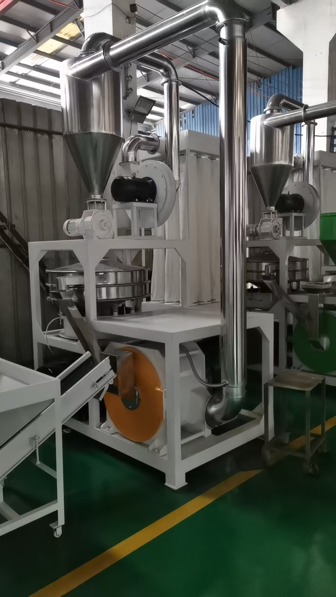 張家港市佳諾機(jī)械高性能塑料磨粉機(jī)是我公司在引進(jìn)國(guó)外先進(jìn)生產(chǎn)工藝和技術(shù)的指導(dǎo)下,精心研制的新一代磨粉機(jī)該設(shè)備在塑料、橡膠、化工等行業(yè)具有廣泛應(yīng)用。是生產(chǎn)廠家降低成本、節(jié)約開(kāi)支、塑料回收再造、節(jié)約成本,降低能耗的好幫手。  主軸傳動(dòng)部件采用日本NSK軸承,304不銹鋼磨盤室所用抽風(fēng)管道及出料管道采用304不銹鋼制造,采用皮帶傳動(dòng)配上歐式帶輪,拆卸維修方便,根據(jù)要求物料磨粉目數(shù)要求,配有10-120目篩網(wǎng),振動(dòng)篩內(nèi)有彈力球,是物料流動(dòng)性好,不堵料。 塑料磨粉機(jī)的設(shè)備特點(diǎn) 德國(guó)的電器、品牌的配置。 耗電少、產(chǎn)量高。 結(jié)構(gòu)簡(jiǎn)單、安裝方便。 磨盤動(dòng)刀與定刀間隙,采用特定調(diào)節(jié)(三分鐘完成),新型簡(jiǎn)單,便于控制粉體大小。 主機(jī)設(shè)有風(fēng)循環(huán)冷卻系統(tǒng)。